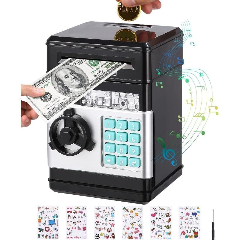 Esta hucha funciona como un cajero automático digital. Es perfecta para niños y adultos que quieren un toque moderno y seguro para guardar su dinero.