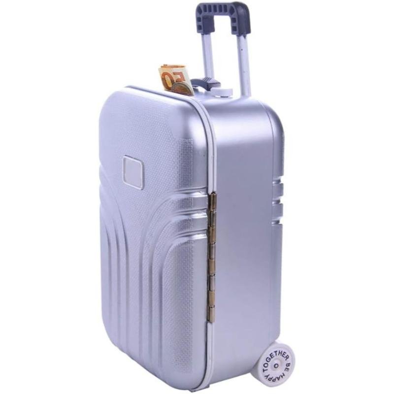 Una opción divertida y decorativa. Esta hucha tiene forma de mini maleta con ruedas, perfecta para los viajeros de corazón.
